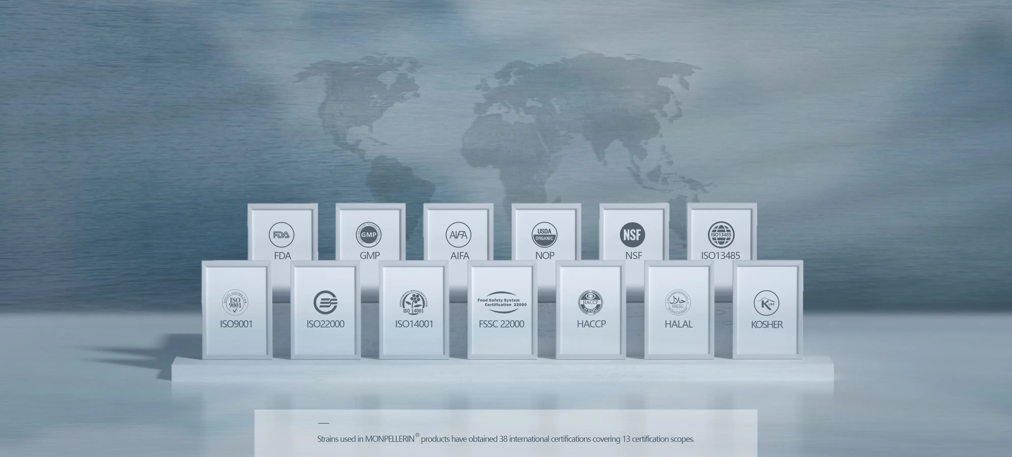 Consumers' concerns are Monpellerin's top priority. Therefore, Monpellerin adheres to the strict pharmaceutical-grade standards and the EU GMP standards to inspect the whole process of "labor force- production equipment-raw materials-rules and regulations-environment" . Here, the quality management system is more than the paperwork but implemented throug the entire production cycle. Monpellerin uses probiotical strains with 38 international certifications in 13 certification scopes.